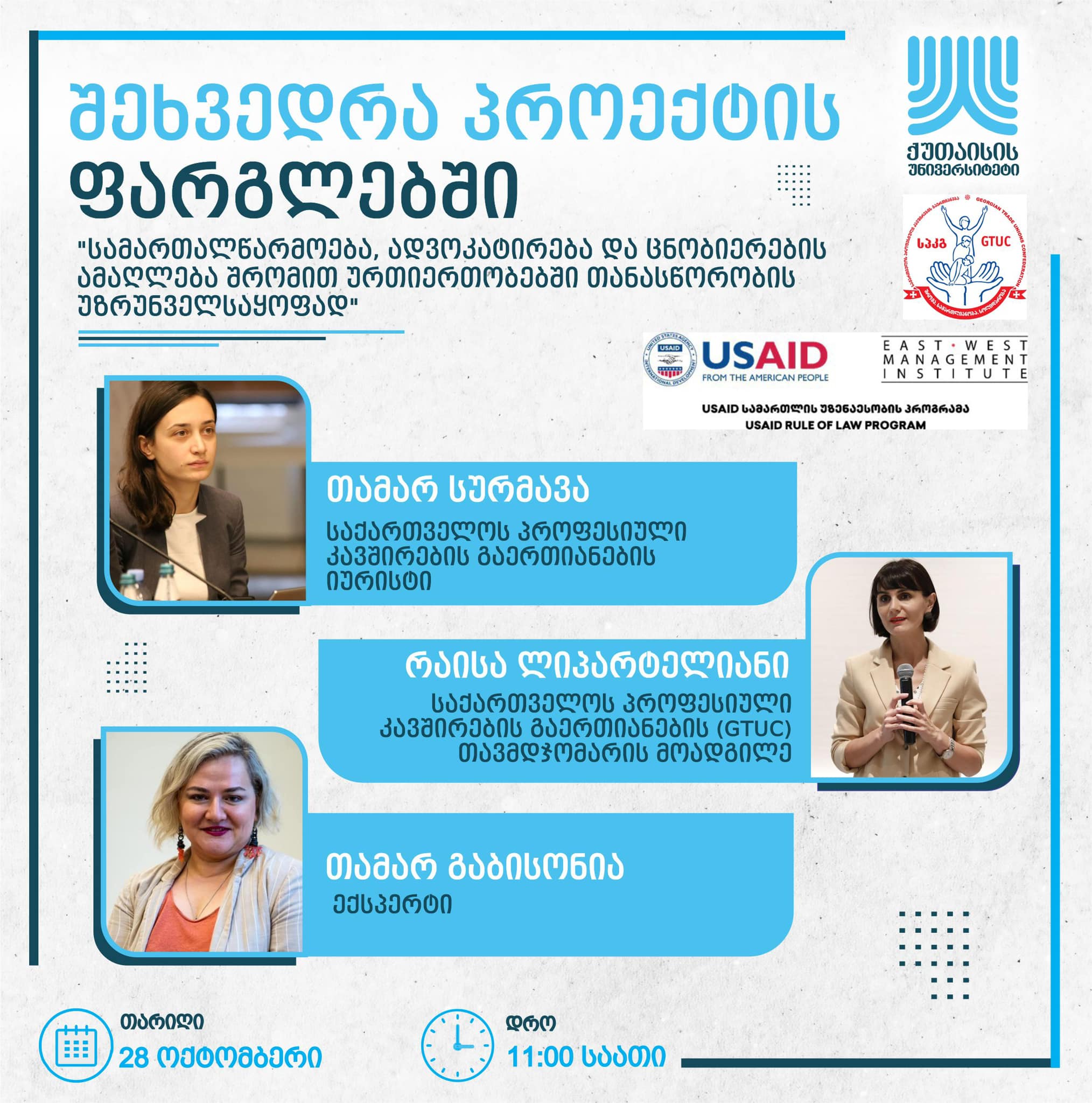 28 ოქტომბერს, 11:00 საათზე შეხვედრა პროექტის – სამართალწარმოება, ადვოკატირება და ცნობიერების ამაღლება შრომით ურთიერთობებში თანასწორობის უზრუნველსაყოფად – ფარგლებში გაიმართება, რომლის მთავარ სამიზნე ჯგუფს წარმოადგენს პლატფორმაზე დასაქმებულები და სტუდენტები.