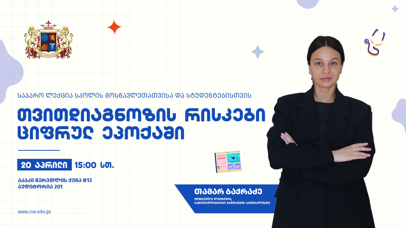 20 აპრილს “ევროპის ცენტრალურ უნივერსიტეტში" სკოლის მოსწავლეებისა და სტუდენტებისთვის საჯარო ლექცია, თემაზე: "თვითდიაგნოზის რისკები ციფრუ...