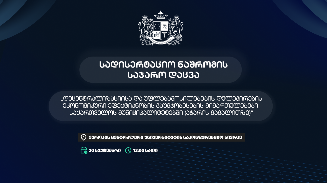 13 სექ სოციალურ მეცნიერებათა, ბიზნესისა და სამართლის ფაკულტეტის სიახლეები სადისერტაციო ნაშრომის საჯარო დაცვა სექტემბერი 22, 2025 By CUE 20 სექტემბერს, 13:00 საათზე,"ევროპის ცენტრალური უნივერსიტეტის" საკონფერენციო დარბაზში გაიმართება სოციალურ მეცნიერებათა, ბიზნესისა და სა... სრულად წაკითხვა