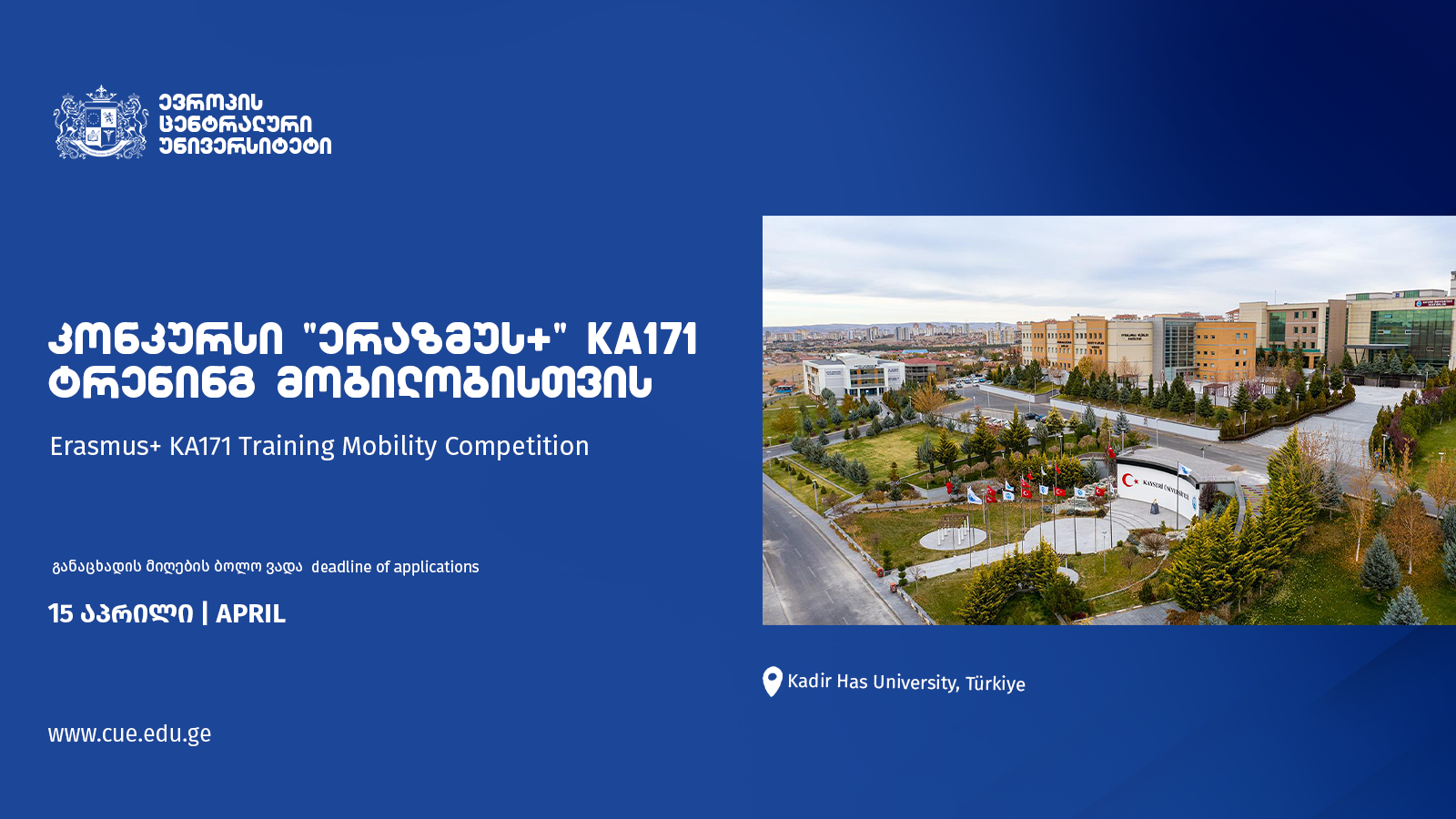 “Central University of Europe” announces an internal selection process for Erasmus+ KA171 Staff Training Mobility as part of its collaboration with Kadir Has University (Turkey).