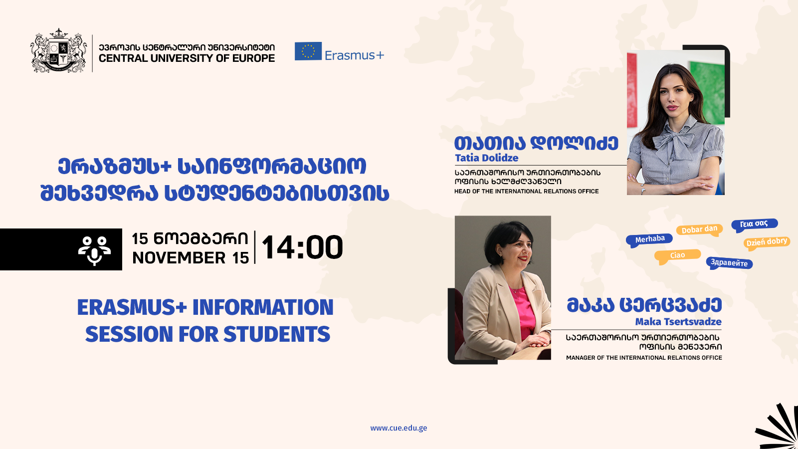 “ევროპის ცენტრალური უნივერსიტეტი” აცხადებს ონლაინ საინფორმაციო შეხვედრას “ერაზმუს+” KA171 საერთაშორისო საკრედიტო მობილობისთან დაკავშირებით, რომელიც ეხება 2025–2026 სასწავლო წლის გაზაფხულის სემესტრისთვის გამოცხადებულ სტუდენტურ გაცვლით პროგრამებს.