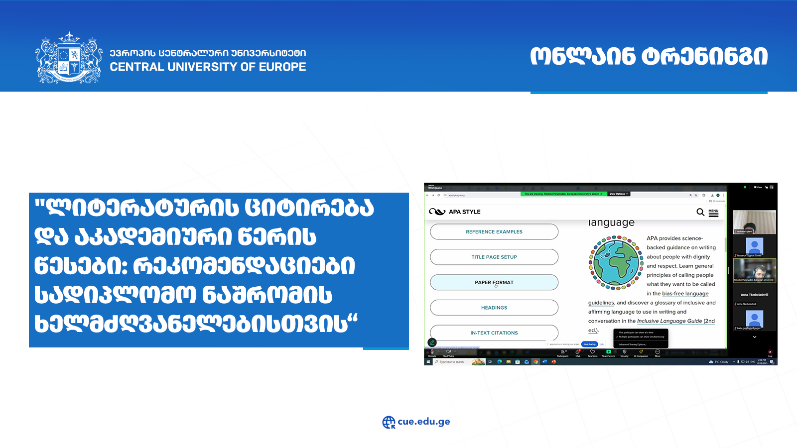 10 დეკემბერს, “ევროპის ცენტრალური უნივერსიტეტის” სოციალურ მეცნიერებათა, ბიზნესისა და სამართლის ფაკულტეტის აკადემიური და მოწვეული პერსონალისთვის ტრენინგი თემაზე – “ლიტერატურის ციტირება და აკადემიური წერის წესები: რეკომენდაციები სადიპლომო ნაშრომის ხელმძღვანელებისთვის” გაიმართა.