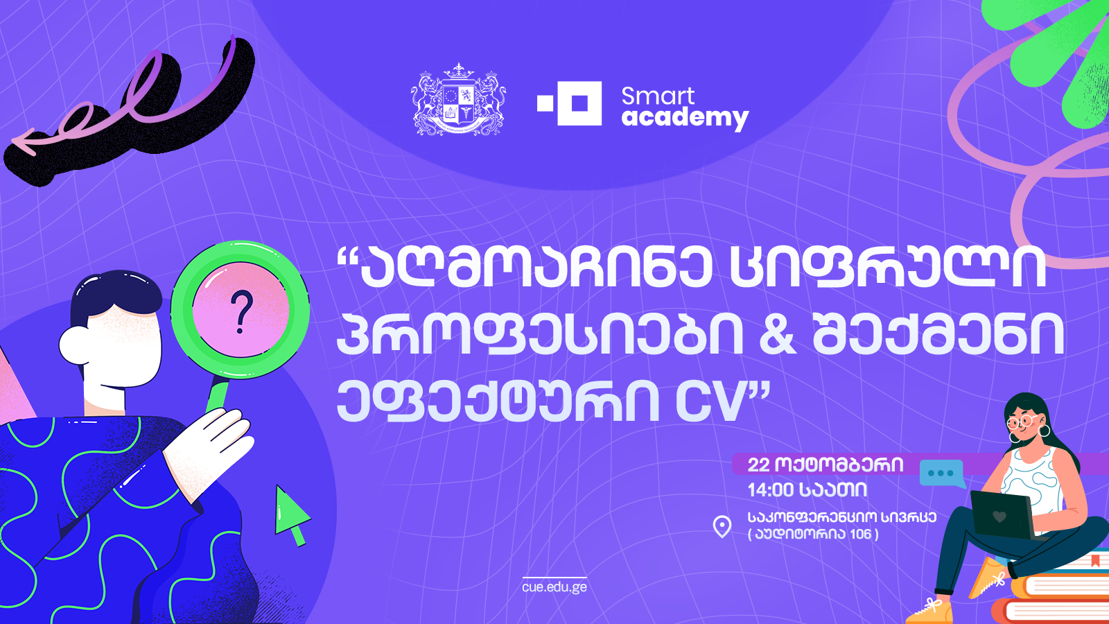 “ევროპის ცენტრალური უნივერსიტეტი” და სმარტ აკადემია გიწვევთ საინფორმაციო შეხვედრაზე, სადაც მონაწილეობით შესაძლებლობა გექნება უკეთ გაეცნო ციფრულ სამყაროში არსებულ თანამედროვე პროფესიებს და კარიერულ შესაძლებლობებს.