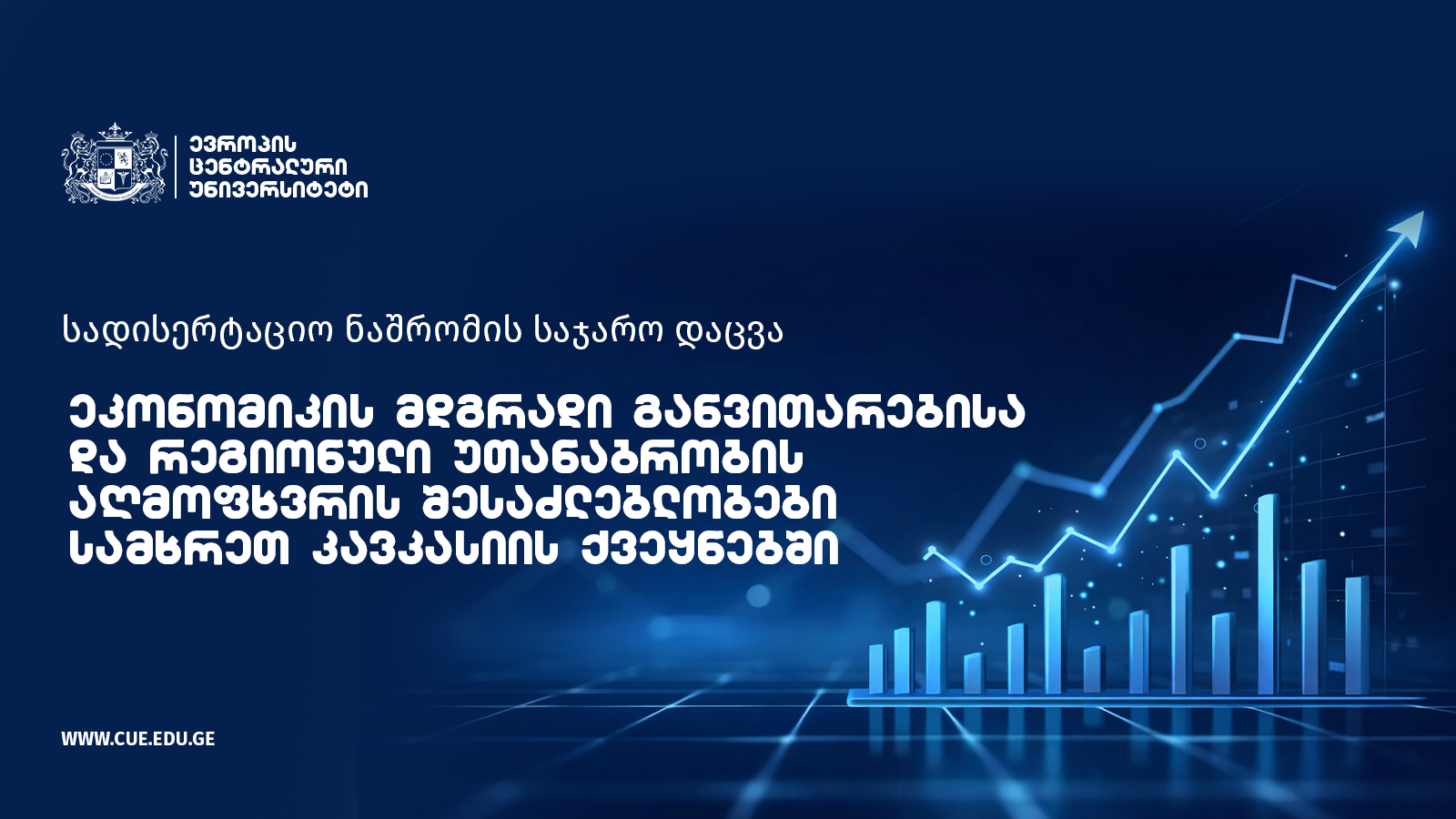 “ევროპის ცენტრალური უნივერსიტეტის” სოციალურ მეცნიერებათა, ბიზნესისა და სამართლის ფაკულტეტის, ეკონომიკის სადოქტორო საგანმანათლებლო პროგრამის დოქტორანტ სალომე ქარჩხაძის სადისერტაციო ნაშრომის “ეკონომიკის მდგრადი განვითარებისა და რეგიონული უთანაბრობის აღმოფხვრის შესაძლებლობები სამხრეთ კავკასიის ქვეყნებში “გაიმართება.