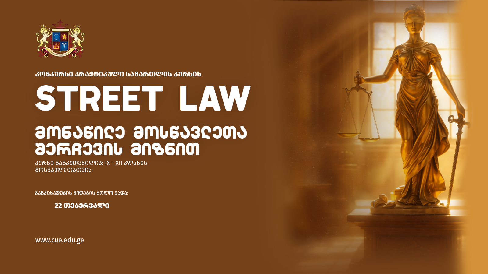 “ევროპის ცენტრალური უნივერსიტეტი” აცხადებს მოსწავლეთა მიღებას პრაქტიკული სამართლის კურსში ‘’STREET LAW” მონაწილეობისათვის. პრაქტიკული სამართლის კურსის მიზანია საბაზისო სამართლებრივი საკითხების სწავლება, რომელთა ცოდნაც მნიშვნელოვანია საზოგადოების სრულფასოვანი წევრობისა და აქტიური მოქალაქეობისათვის.