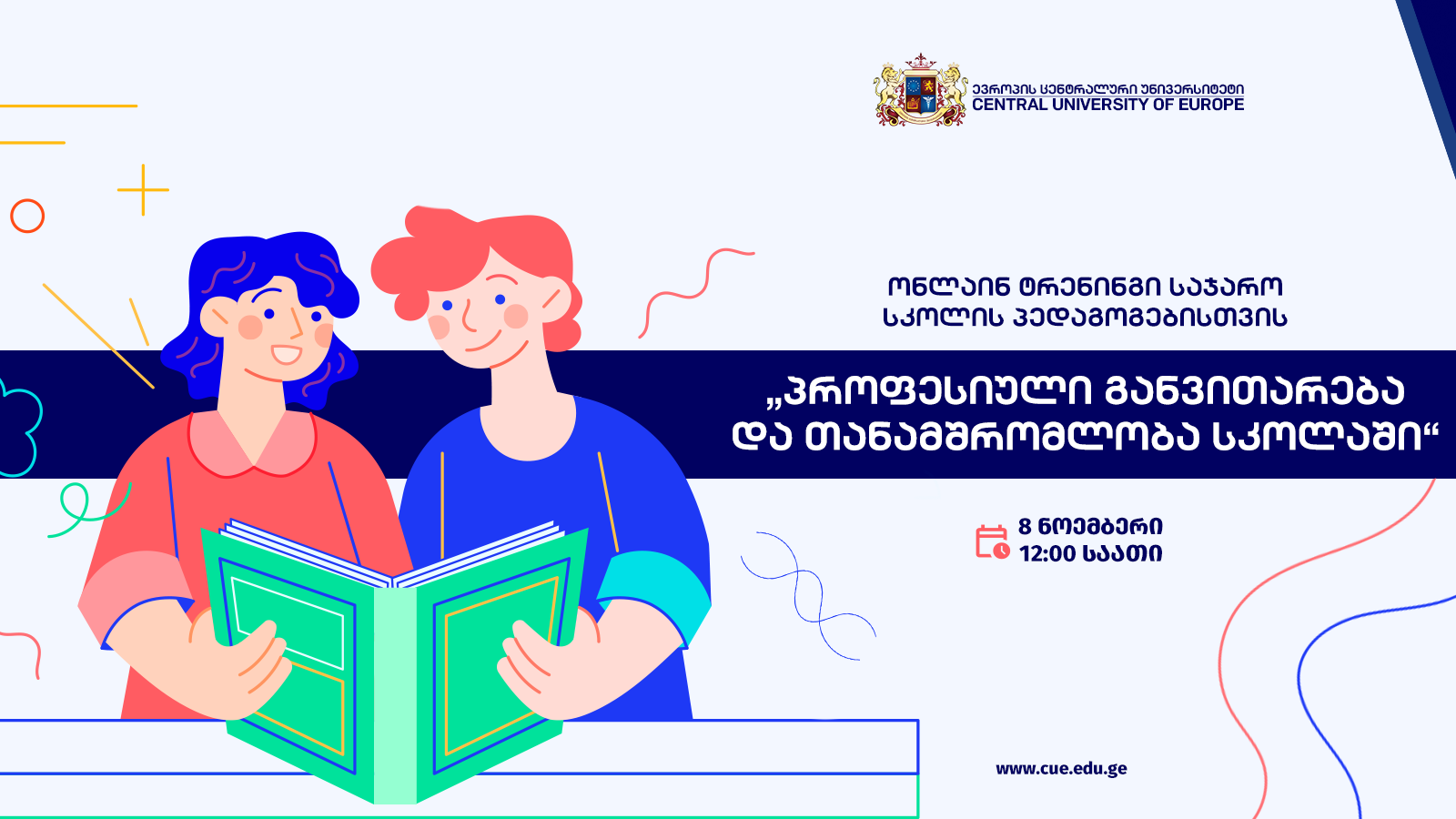 “ევროპის ცენტრალური უნივერსიტეტის” და “ევროპის უნივერსიტეტის” ორგანიზებით, საჯარო სკოლის პედაგოგებისთვის უფასო ტრენინგი თემაზე: „პროფესიული განვითარება და თანამშრომლობა სკოლაში” გაიმართება, რომელიც ორგანიზებულია, სწავლების ინოვაციური მეთოდების ტრენინგ ცენტრის მიერ.