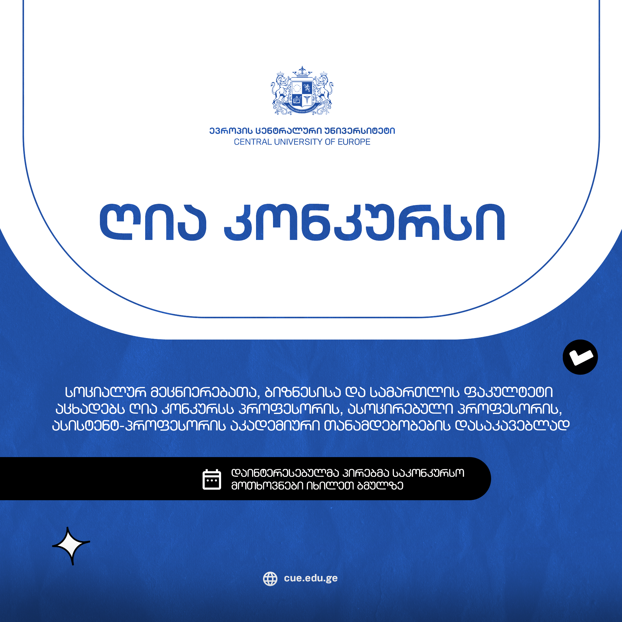 ,,ევროპის ცენტრალური უნივერსიტეტი’’ სოციალურ მეცნიერებათა, ბიზნესისა და სამართლის ფაკულტეტი აცხადებს ღია კონკურსს პროფესორის, ასოცირებული პროფესორის, ასისტენტ-პროფესორის აკადემიური თანამდებობების დასაკავებლად: